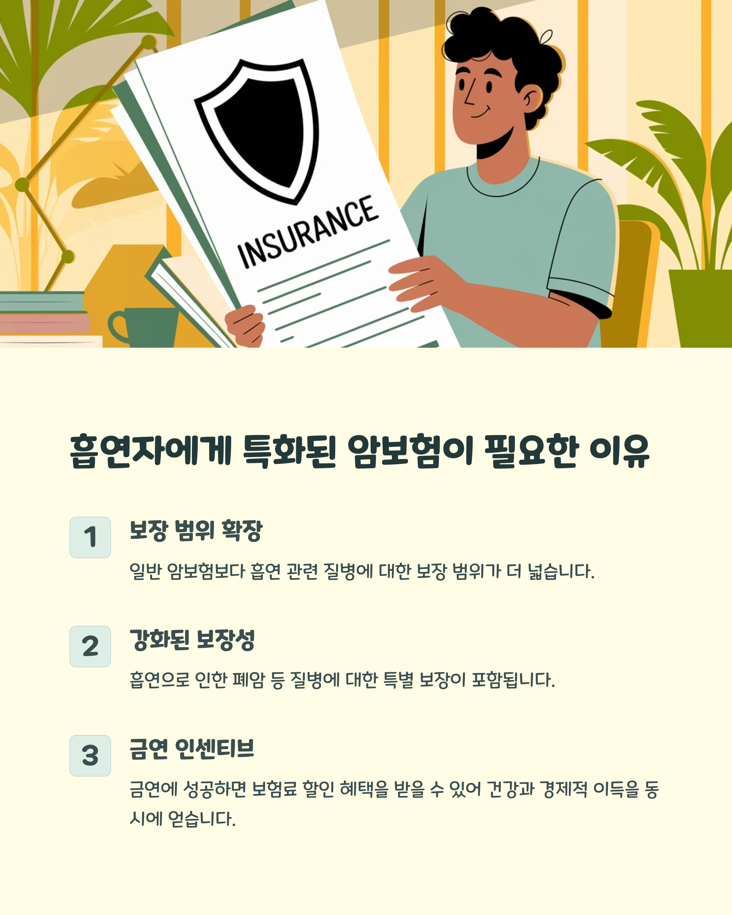 흡연자는 폐암 발병 위험이 높은 만큼 보장 범위가 넓고, 경제적 부담을 덜 수 있는 보험을 선택하는 것이 중요해요.